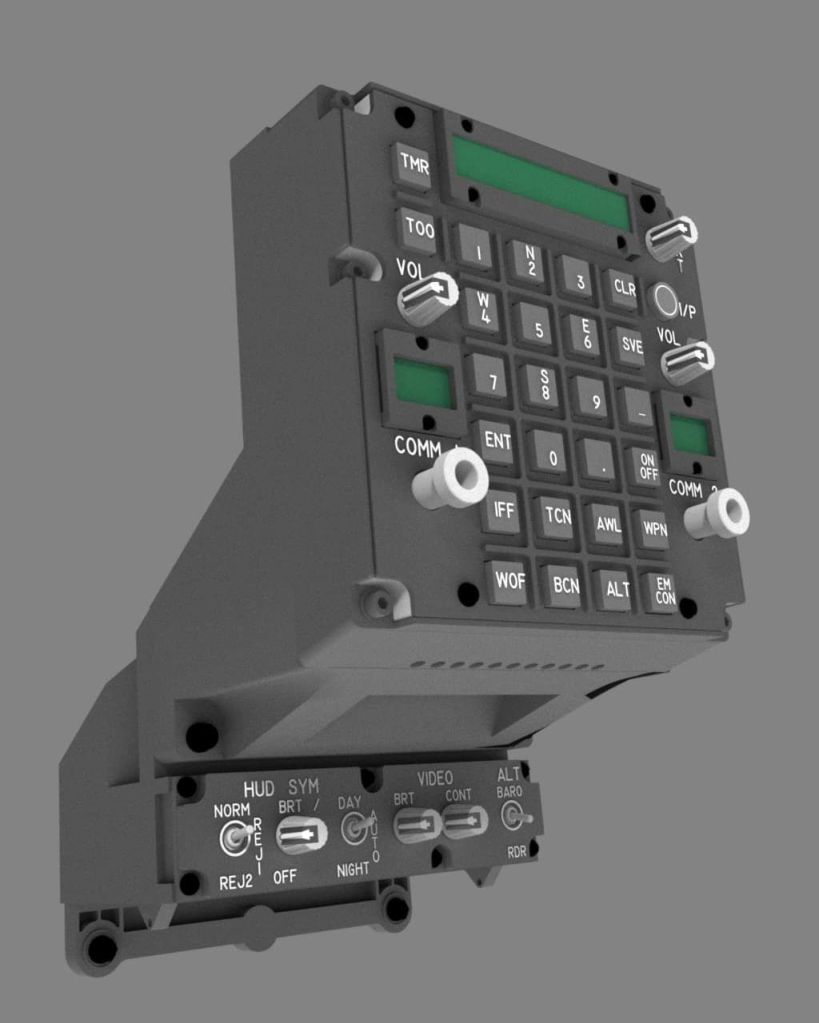 Here is a test render that I did from FreeCAD showing the latest work on the UFC. I still need to complete the mounting interfaces between the different 3D printed components, and I need to design the circuit and PCB for the UFC. I am still deciding on using an Arduino for just the displays and a separate micro for the inputs (registered as a HID device) versus using DCS-BIOS for inputs. The thought is that an HID would be more responsive for inputs versus DCS-BIOS (which will still be used for the output displays).
