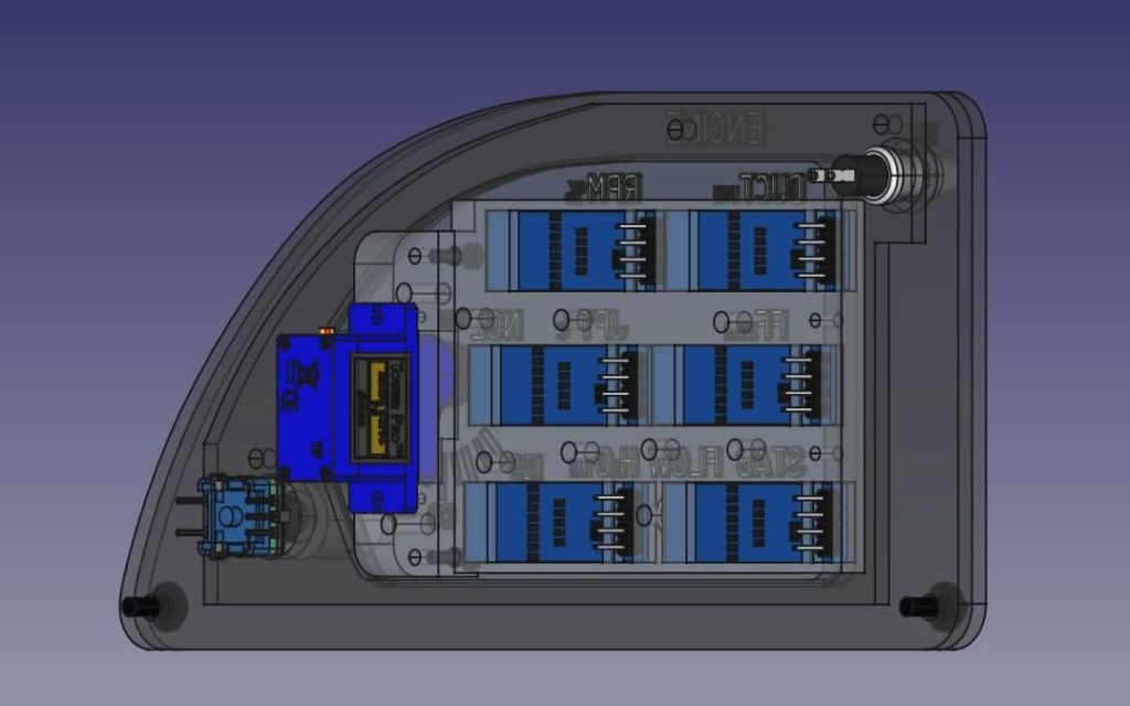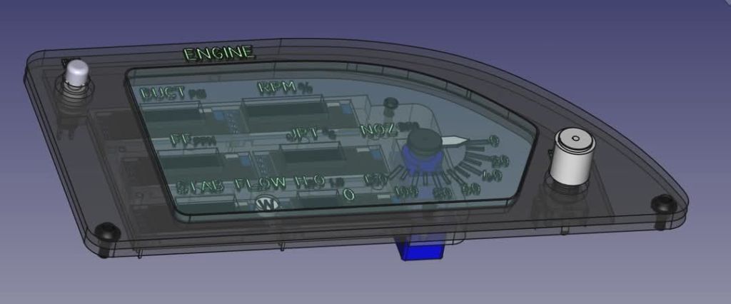 The engine panel contains 6 windows of numerical number drums which we simulated using 128×32 pixel OLED displays. It also contains an analog needle that depicts the nozzle position, a brightness knob, a BIT test push button, and a water injection indicator. We use a TowerPro SG90 micro servo for the analog indicator, and a potentiometer or rotary encoder for the brightness knob, and a simple momentary push button for the BIT test. We also use a 2mm laser cut piece of clear acrylic to cover and protect the display area. We use a 3d printed tray to hold the OLED displays and the mount the servo.